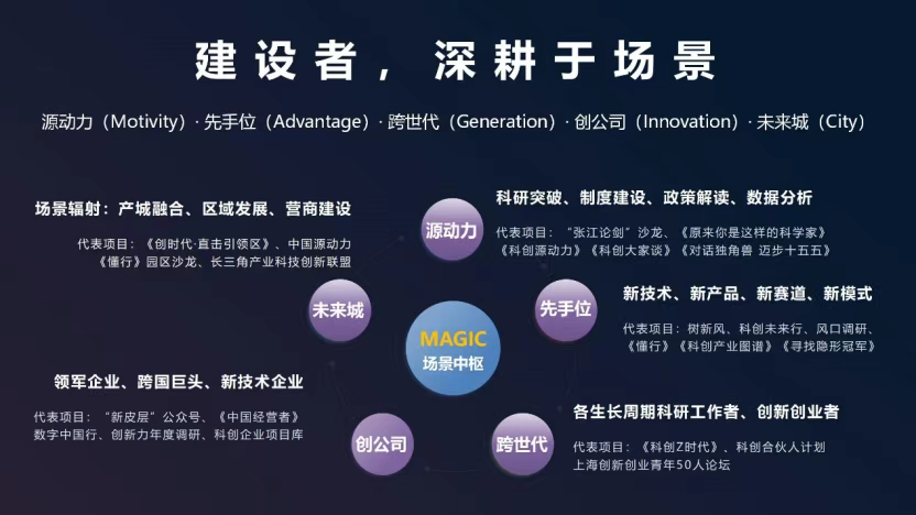 “1科创”坚持“项目即场景”理念,面向科研、技术、资本、人才、企业等生态主体和要素,设计了源动力、先手位、跨世代、创公司、未来城五大场景类别,并以专栏英文首字母汇集成了“MAGIC”的缩写。由此可实现内容标签化、项目结构化、用户场景化的处理,让场景可复用、让项目可拓展、让用户可集群。
