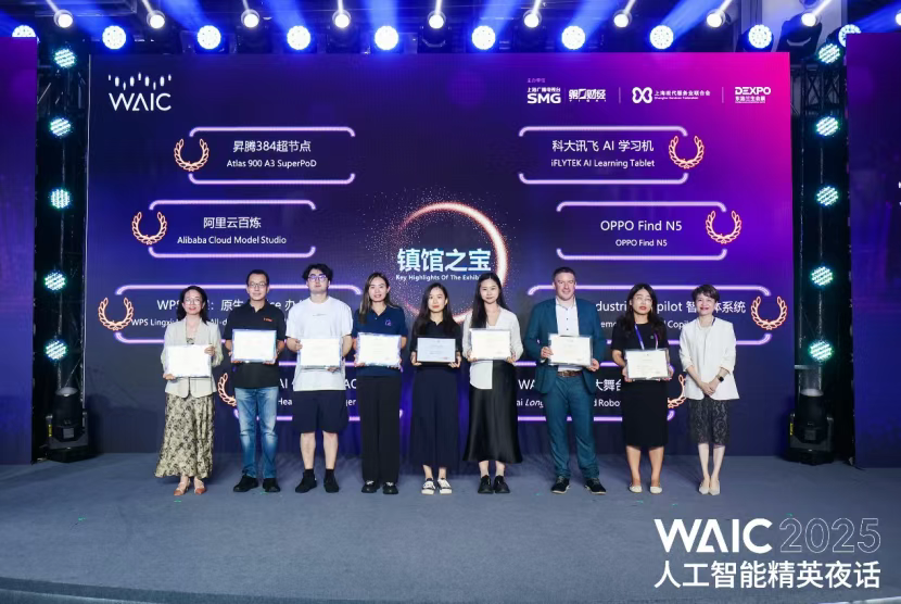 经过激烈的角逐,2025WAIC镇馆之宝奖项在活动中亮相,东浩兰生(集团)有限公司副总裁周瑾女士为多家企业和机构颁发了WAIC镇馆之宝的奖项。